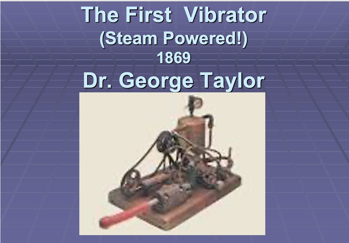 In the mid-1860s, electricity had not yet been harnessed for power. Before electricity, steam was the source of power, not just for trains but also—you guessed it—for vibrators.